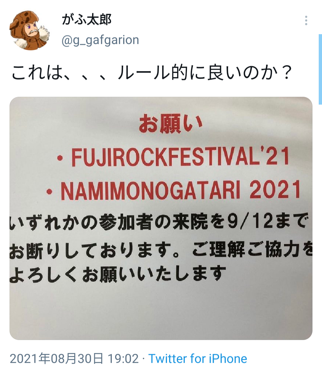 病院さん「フジロックとNAMIMONOGATRI参加者の来院をお断りします」 2021年08月31日 カテゴリ:twitter 1: プランクトミセス(SB-Android) [US] 2021/08/31(火) 11:53:07.91 ID:0x1q4M7w0● BE:866556825-PLT(21500) https://twitter.com/g_gafgarion/status/1432282662471802884?s=19 https://twitter.com/5chan_nel (5ch newer account) 【病院さん「フジロックとNAMIMONOGATRI参加者の来院をお断りします」】の続きを読む